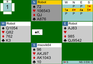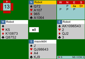 שוב היריבים הגיעו ל-♠4. הפעם עליתי ל ♥5 בביטחון מלא – ידעתי שזה החוזה הנכון, ואפילו חששתי שאנחנו מפספסים סלם.
