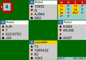 הכרוז כיסה עם הJ , השותף שיחק Q, ופתאום ה־9 שלי הפך ללקיחה! בגלל חוסר התאמה וחלוקה גרועה בסדרות האדומות לכרוז לא יותר מ 11 לקיחות. בשולחן שלנו הבוט נפל פעמיים כששותפי הצייתן זכה עם A♦ והחזיר ♣.
